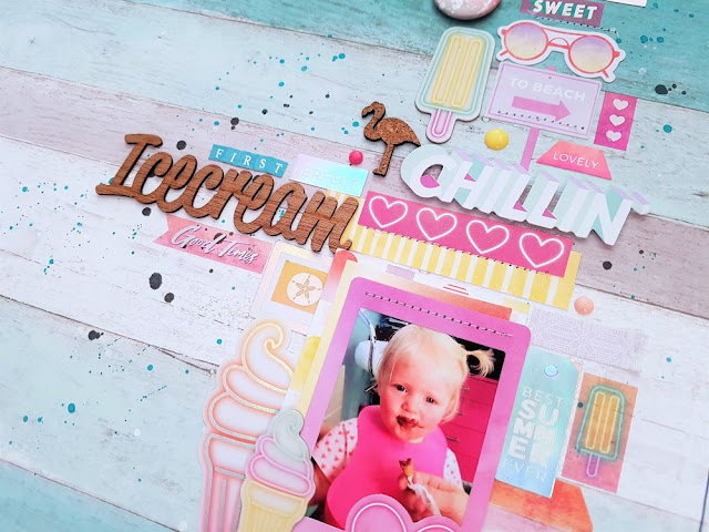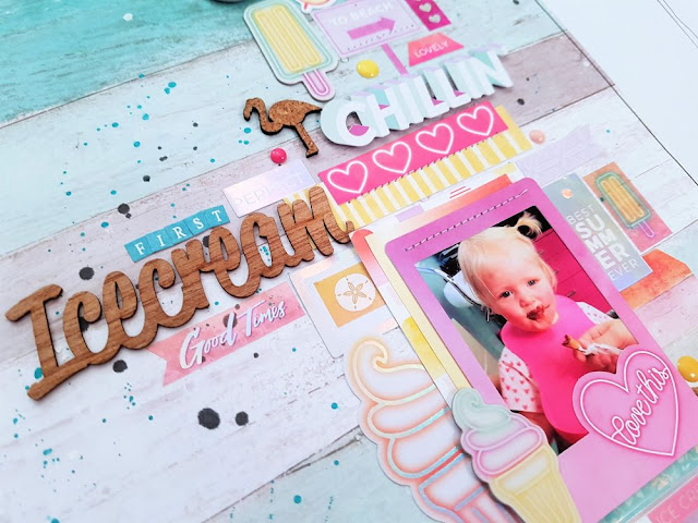 My layout was inspired by one created recently by Anna Komenda! I just love how the brights look against the washed teal background paper! I absolutely love this photo of my gorgeous niece trying out icecream for the first time! It was perfect to use with this awesome collection!