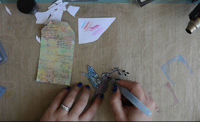 I then cut out the hummingbird and using a waterpen, I then applied Distress Oxide Inks Seedless Preserves and Salty Ocean to my hummingbird and applied some cheesecloth to the back. I then inked around the edges of the tag using Distress Oxide Ink Black Soot.