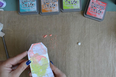 Then using the dabbing technique I applied the following Distress Oxide Inks - Twisted Citron, Peacock Feathers, Abandoned Coral and Wild Honey. (I stamped the inks onto my craft mat and spritzed with water before dabbing and dried in between colours)