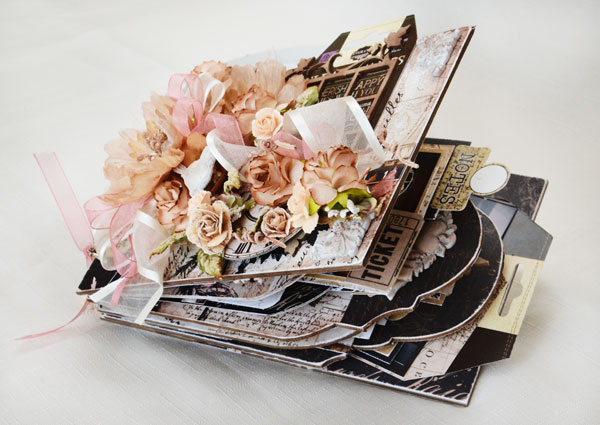 I created a beautiful dimensional floral arrangement for the front cover of the album. I even incorparated some of the Prima packaging.