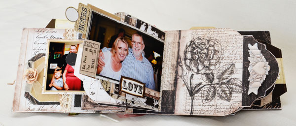 I added hints of dusty rose ribbon throughout the album to add a feminine splash of colour and a few of the Prima Resin Treasures as they just blended so well with the look I was going for. I distressed all the edges and then dust lightly with dark chocolate ink.