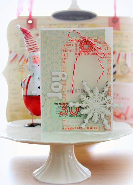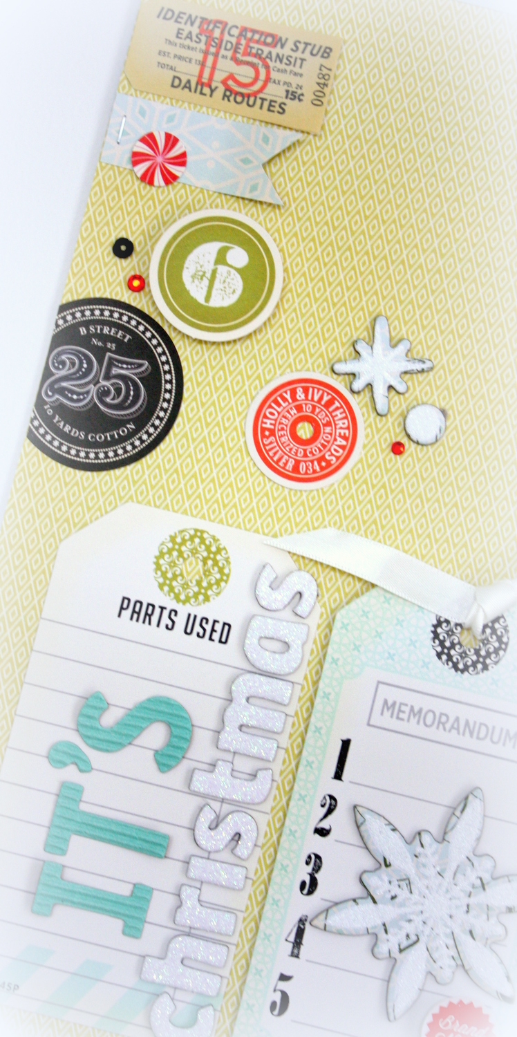 For my card I cut a piece of Park Place pattern paper and machine stitched it to the card. I then used another tag from the Parcel Tags set , threaded through some twine and attached it to the front of my card. I added a ticket stub from the Ephemera pack and a a glitter chipboard snowflake. I then added some soft white ribbon to finish it off ! The Delight Glitter Thickers are from American Craft.