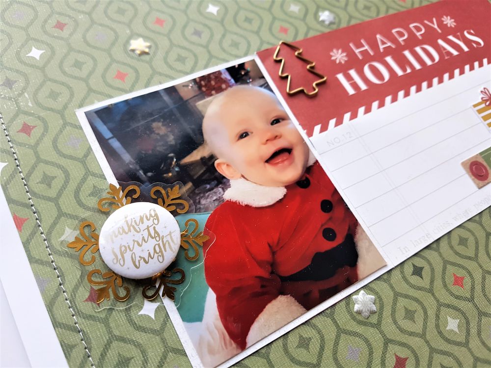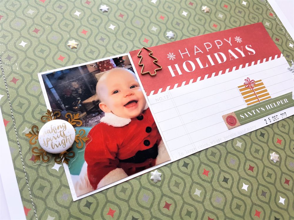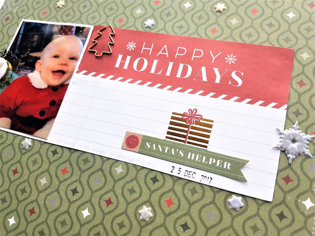 I started by choosing a background paper and then chose my photo and elements that would not over power the photo or the background paper since its quite a busy paper. I matted my photo with white cardstock to help it pop off the green paper. I chose the Happy Holidays journal card to go alongside the photo, I liked how I could add a cluster of embellishments to the journal card.