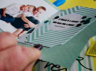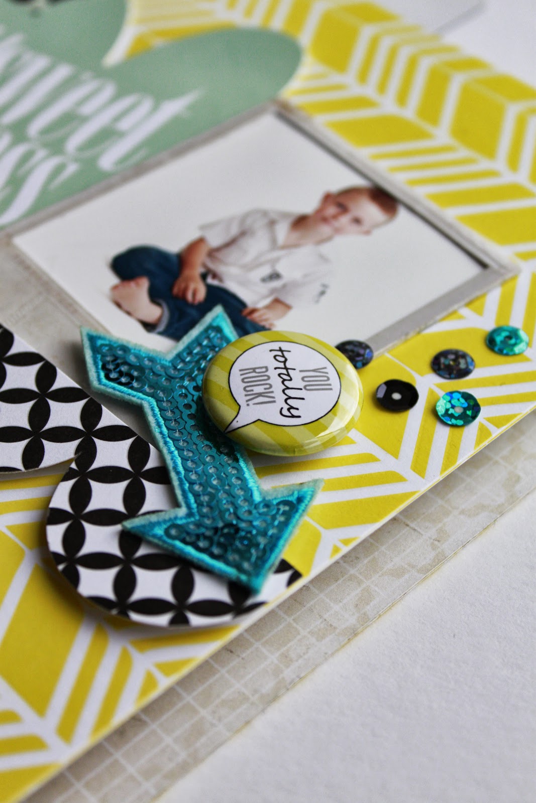 Continuing inside with the sequins, I have used the Heidi Swapp No Limits Disco Arrows for Ethan's theme. Don't forget to use washi as a quick embellishment as it doesn't take away the focus of the pages.