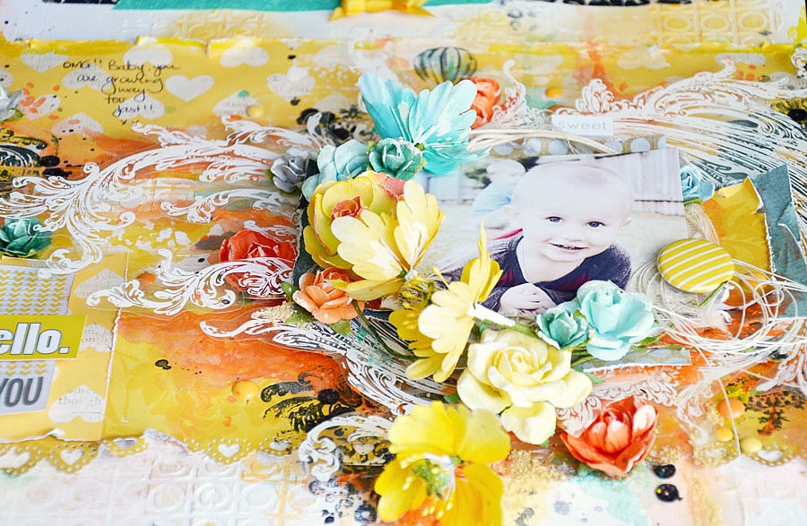As always, I used a lot of Shimmerz on my page. I blended the Dazzlerz Dreamsicle paint into the background by using a small amount of water, just toning the colour back to blend with the yellow paper.