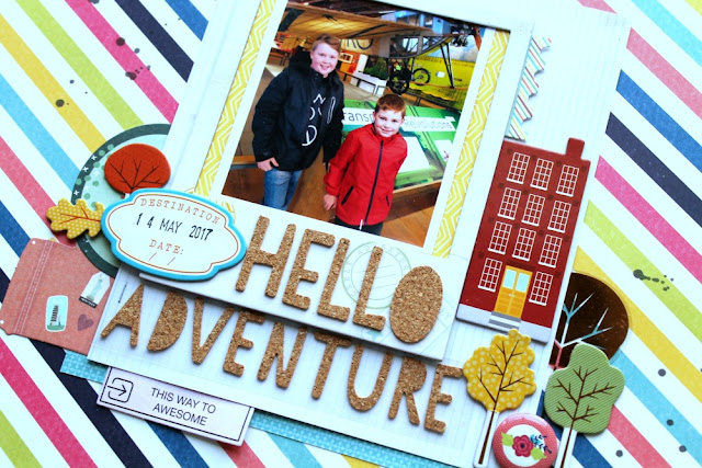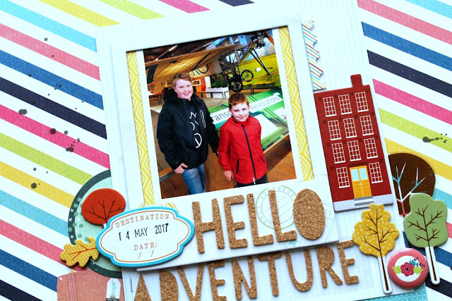 I just love that colourful striped paper and knew I wanted to use it as a background for this layout! The photo I am using is one of my sons from our recent trip to Europe and the UK. We were visiting the Science and Industry Museum in Manchester....the boys loved all the old planes and transport that were there!