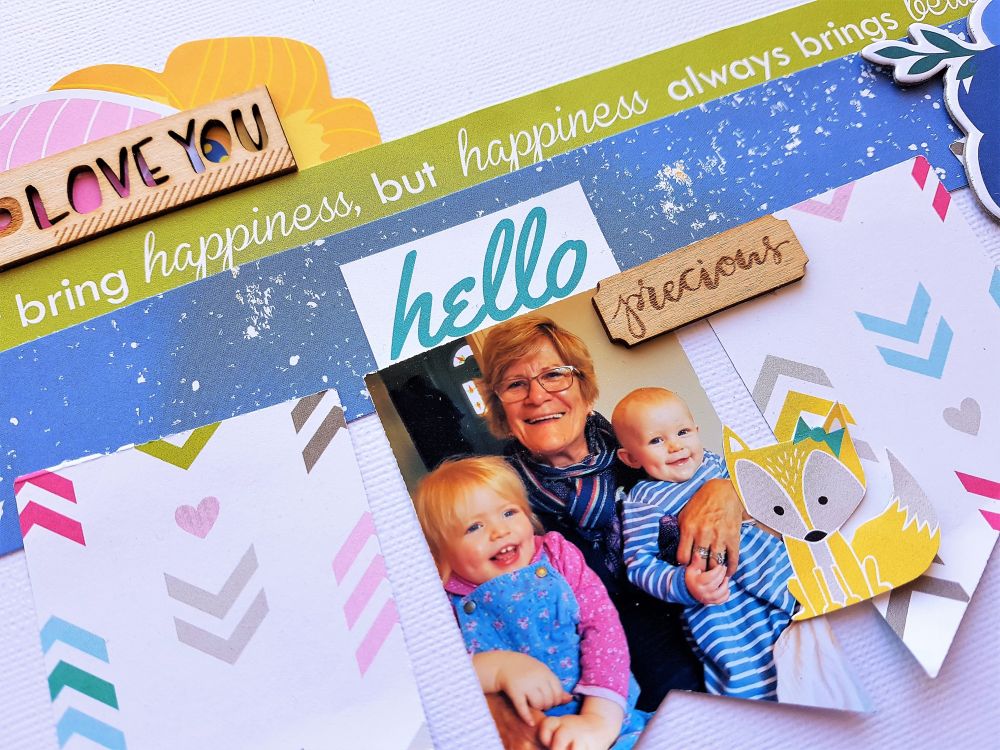 I just had to fussy cut one of the adorable foxes also from the borders paper and added it beside my beautiful photo. The photo is of my 2 gorgeous nieces with my Mum (their Grandma that they call Marnee) when my Mum was visiting them recently. Oh how they love their Marnee!