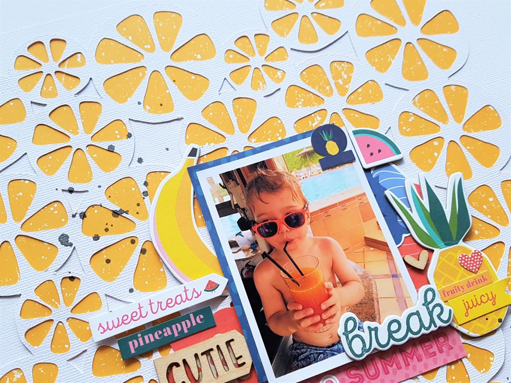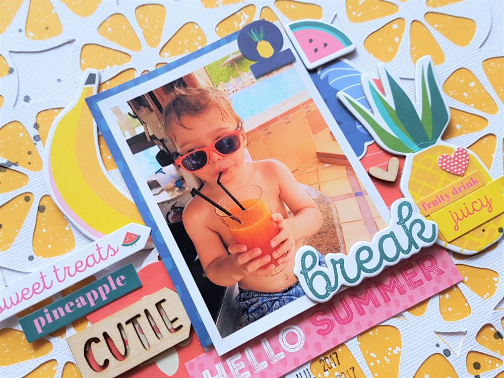 The 'fruity drink' and the 'juicy' stickers had to be added over the top of the chipboard pineapple over on the right side of the page.