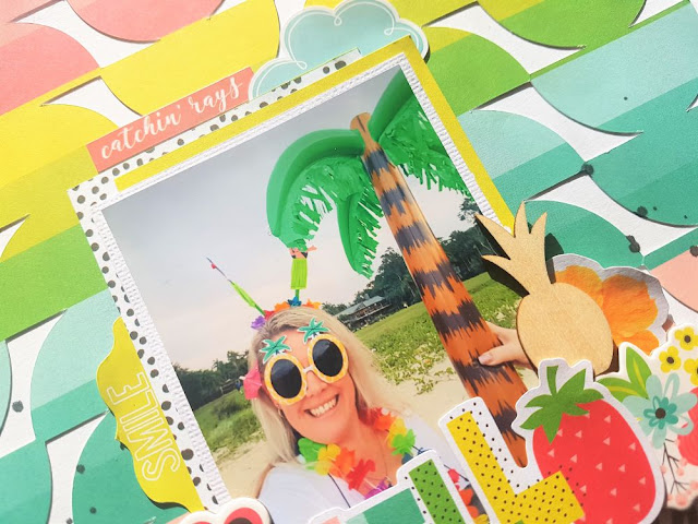 I popped up the 'Hello' die-cut piece that forms part of my title using foam tape and then adhered the 'Summer' flat to the page. I like the interest this gives and the shadows this effect gets on a page. Some of the floral chipboard and die-cut pieces were perfect embellishments to tuck in to each side of the photo.