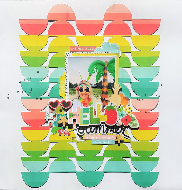 I adhered the cut file straight onto a plain white cardstock background and then started to work out where I wanted to place my photo and embellishments. I decided on the very centre of the layout so that you could see the cut file evenly on both sides. I layered a couple of the coloured papers from the 3' x 4' Elements paper underneath my photo to help it stand out from all those colours in the background paper!