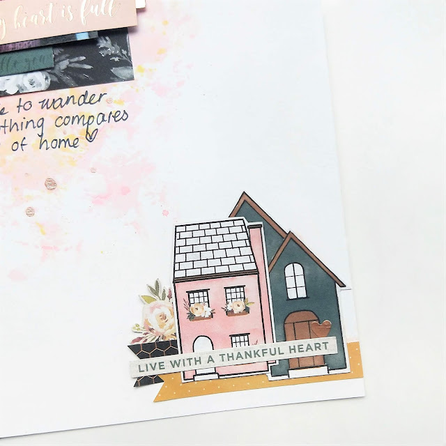 This collection has lots of gorgeous rich tones and copper foil accents but I wanted to achieve a light and airy feel to my page, so I used the patterns sparingly in a series of layers built up beneath my photo which allowed me to use lots of different patterns without overwhelming the page. I used mini thickers to create my title and framed it with one of the wood veneer frames from the collection to prevent it from getting lost on the page, and cut out a few mini houses from the paper range to reinforce my theme.
