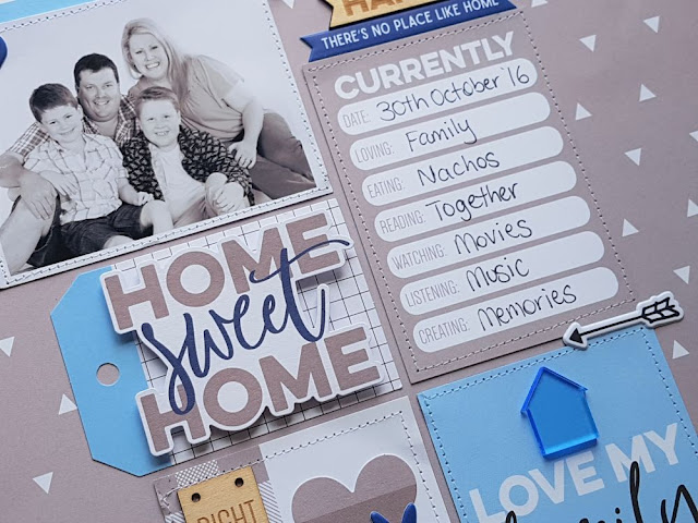 Once my photo and journal cards were adhered, I then embellished my layout using the puffy stickers, wood veneer pieces, acrylic shapes and ephemera. The Home Sweet Home title I used foam adhesive underneath to raise it off the page.