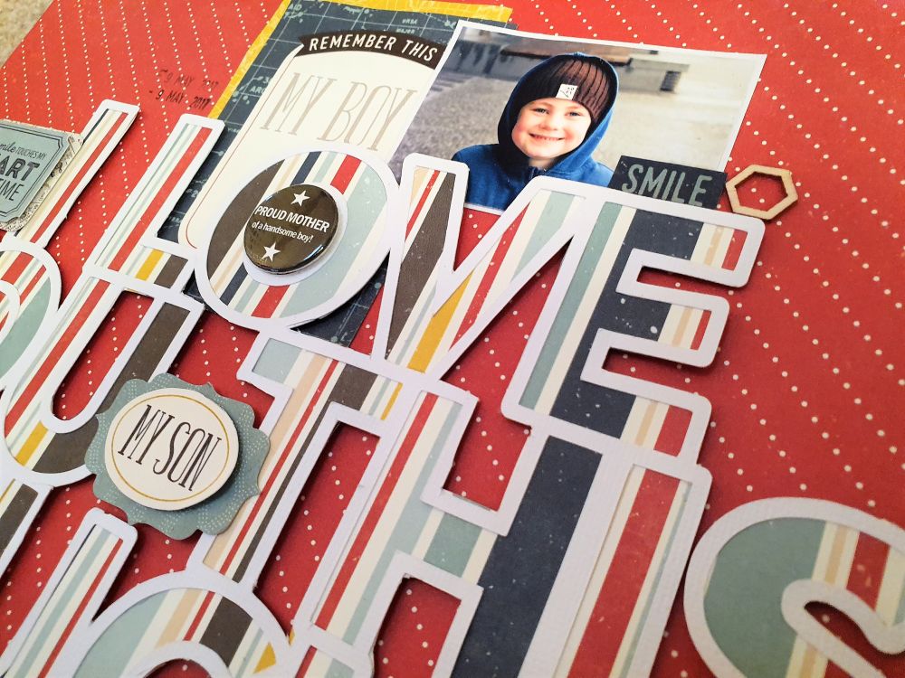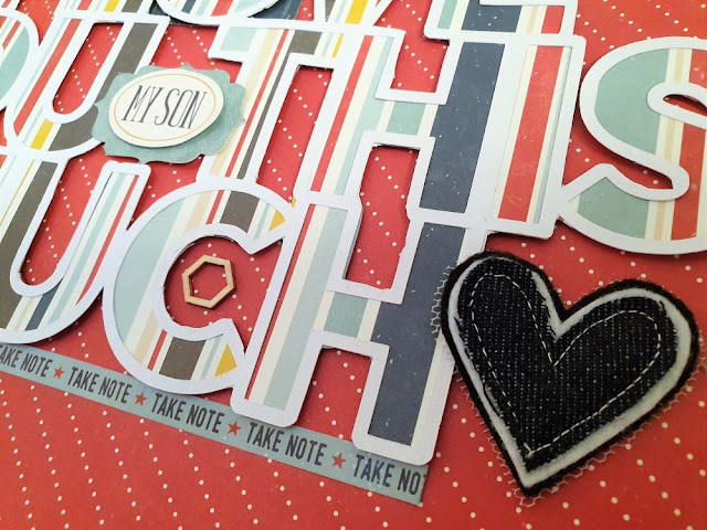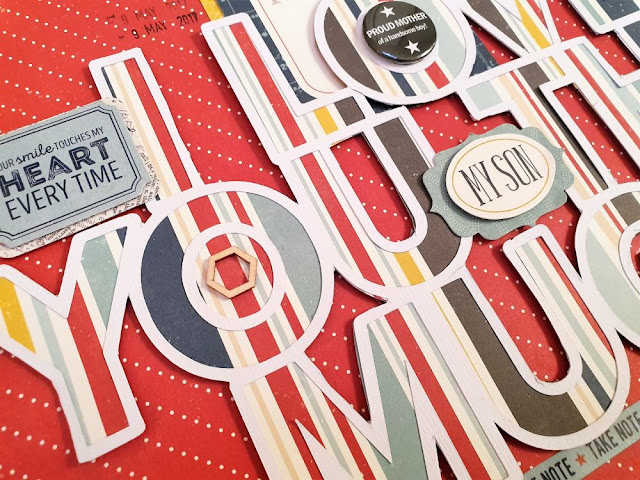 I added some embellishments on top of the cut file like a flair button from my stash and some wood veneer pieces too. The fabric heart was also from my stash, this was added to the right of the bottom of the title. A couple of the stickers from the sticker sheet and the layered stickers were also added and they were perfect for this layout.