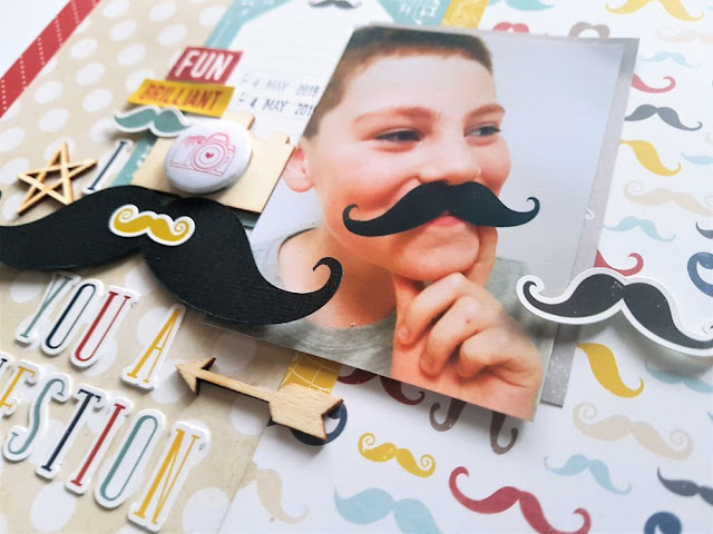 I layered a strip of the yellow globe paper vertically underneath the photo plus I used the journalling card with the moustache to layer some embellishments over. I used some foam dots underneath the big moustache to create some dimension and shadows, the moustache forms part of the title. The rest of the title is made up from the alphabet stickers from the sticker sheet. I also added a few of the word stickers and a couple of pieces of wood veneer from the wood veneer pack. I cut a word off the washi tape roll too.