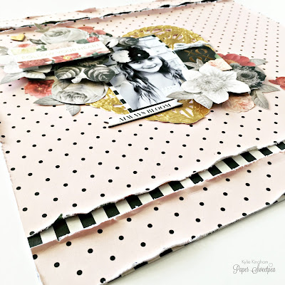 When it came to putting my layout together I used a gold foil heart from my stash as a background.I then began layering all those fussy cut blooms and leaves to opposite corners.I found once I was putting them in place ,I wanted to then add a hint of colour to break it up a little.A few coloured blooms from the die cuts and sticker sheets helped here.