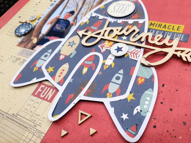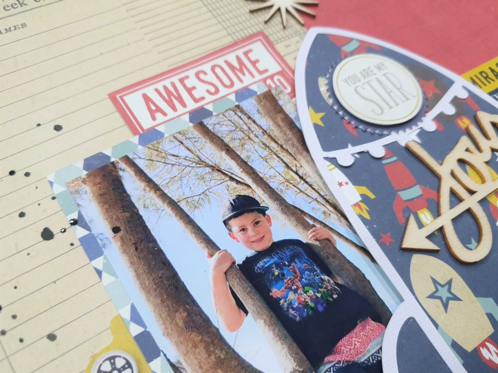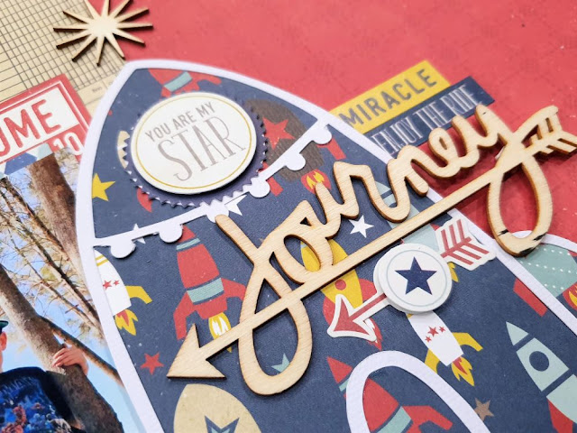I used the Boy Dog Days paper over to the left of the 'B' side of the Stripes paper to break up some of the red. I layered a 3' x 4' journal card underneath my photo and then placed the photo tucked into the left side of the rocket ship.