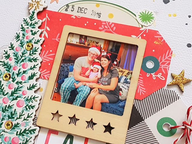 The wood veneer frame, gold thread, baker's twine and flair button are from my stash and are not included with the Fa La La collection...sometimes I see things sitting on my desk that I just want to add to a page so I do!!