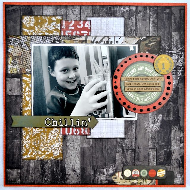 I have to say, this has to be one of my favourite boy ranges EVER! It is just so easy to scrap with, and the colours are perfect for boys of all ages. The specialty paper in this collection, “Industrial”, (which I used as my base paper here), has the most fabulous texture. I sanded it all over to bring a bit more definition to it, and I just love the effect!