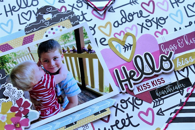 As the paper behind the open heart is on a slight diagonal, I decided to use this as part of my design by adding my photo and embellishments in the same diagonal direction. I used a few of the Love and Adore journaling cards to act as layers under my photo and added a few of the chipboard stickers, ephemera and accessory stickers to complete my layout!