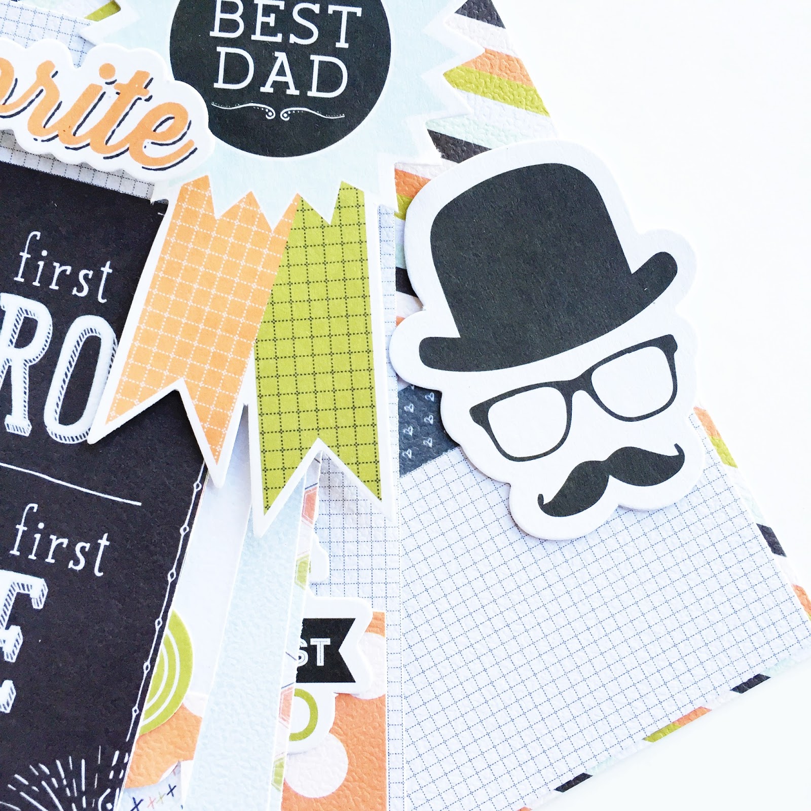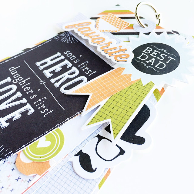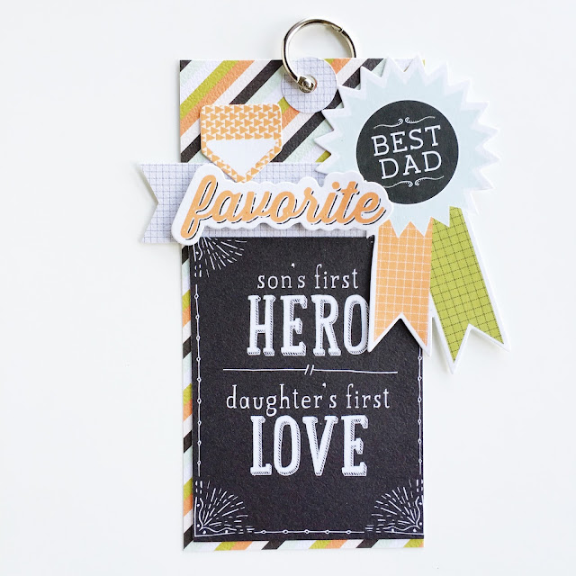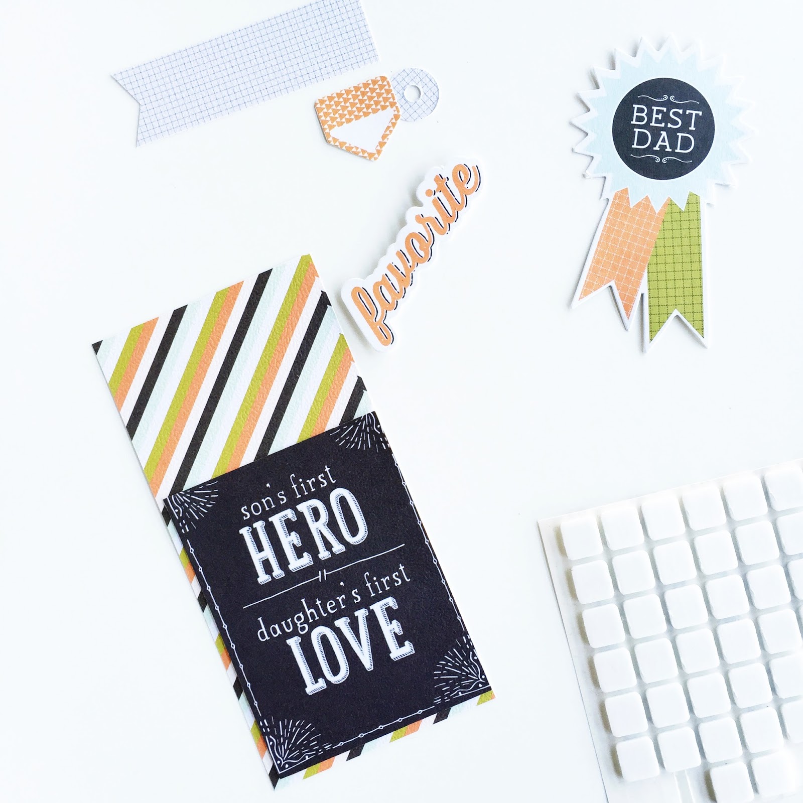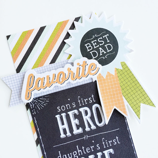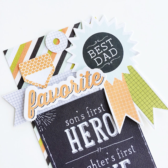 Adhere the die-cut ephemera "best dad" & mount the "favorite" die-cut onto foam tape.