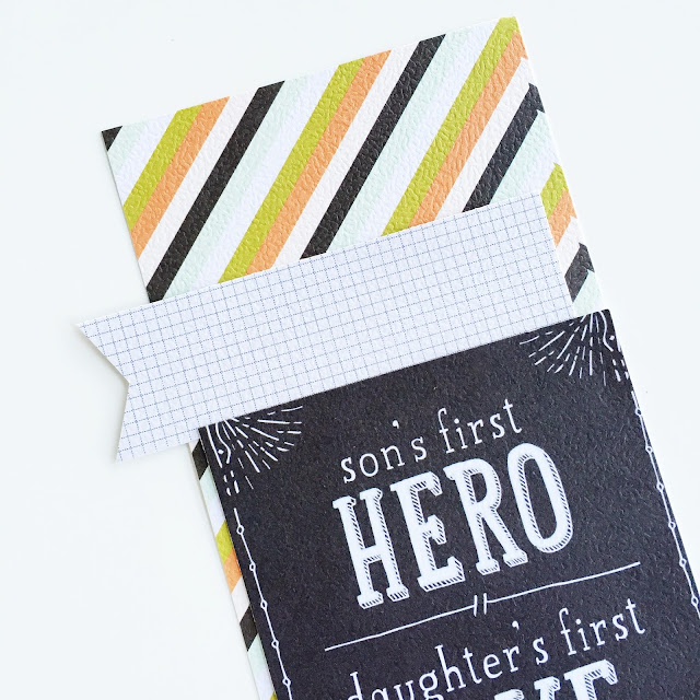 Using the 6"x6" paper pad, select the chevron "Treasure" paper and trim the blackboard 3x4 Project Life card from So Strong.