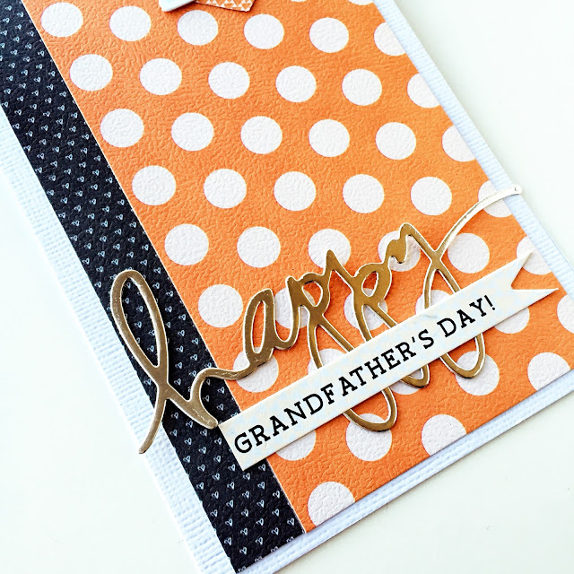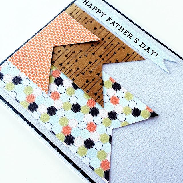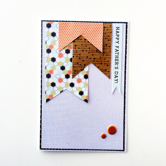 The same layering principle applies to the second card. Trim paper from the mini paper pad to create layers. Using the leftover strips of patterned paper create a three wide banners. Add the "Happy Father's Day" banner from the Ephemera Die-Cuts and complete the card with a few puffy dot stickers.