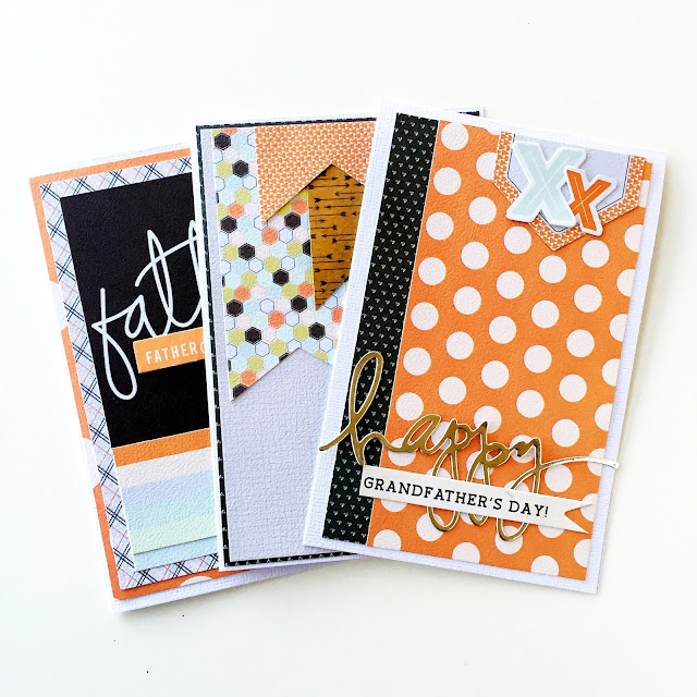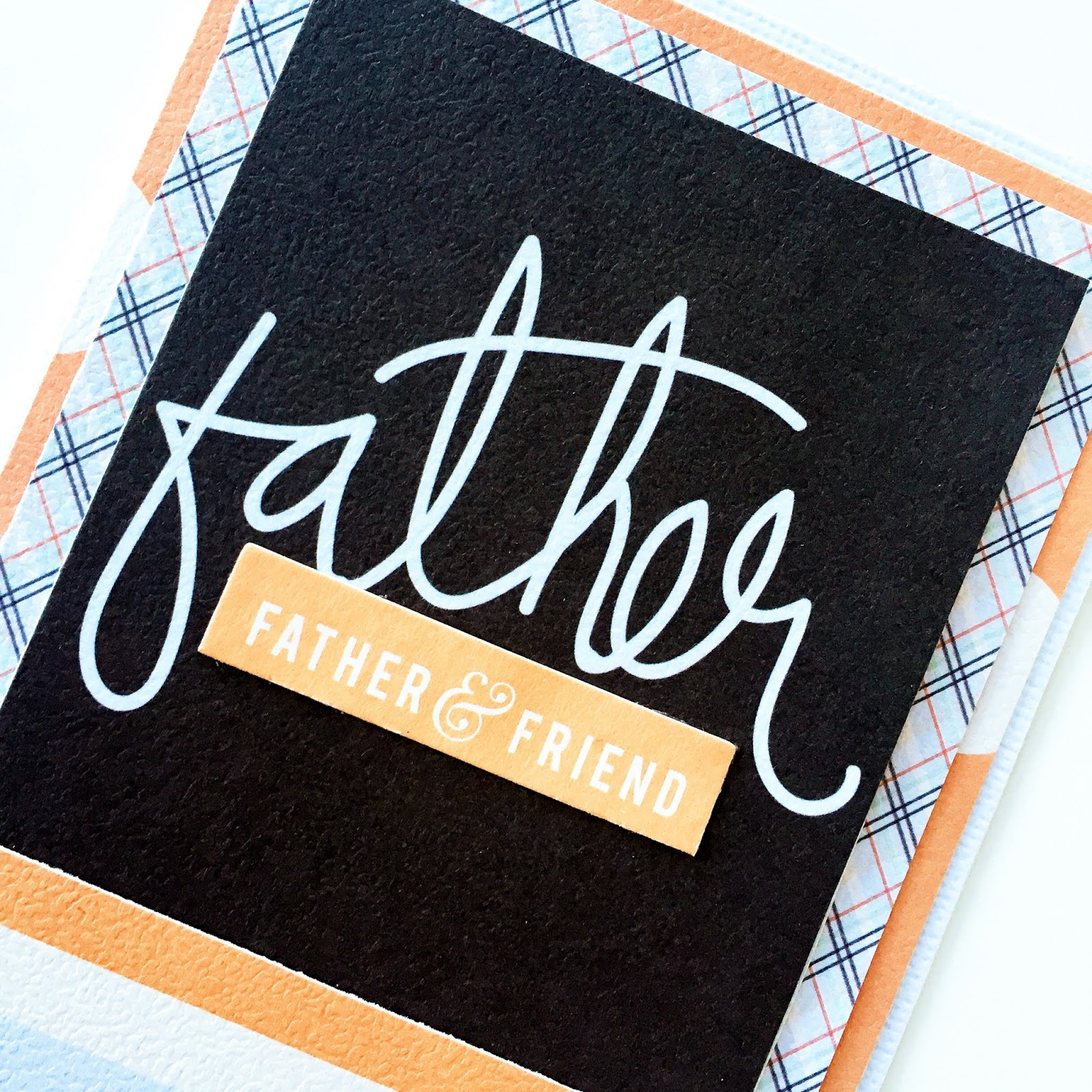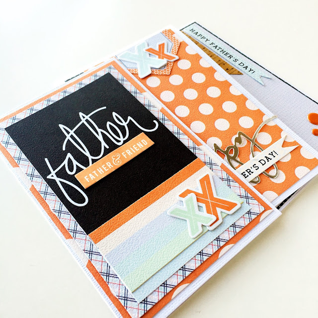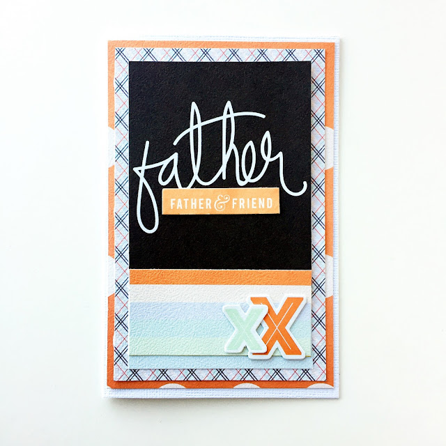 Trim the Good Fellows | Big Fella to 3.75"x5.75" and adhere to the card base. Layer with a piece of paper from the mini paper pad trimmed to 3.5"x5.5". Using the "Father Figure" cut apart on the Good Fellows | So Strong patterned paper, center at the top of the inner layer on the card. Fill the lower part of the card with left over patterned paper (trimmed to 3" in width). Embellish the card with Ephemera Die-Cuts.
