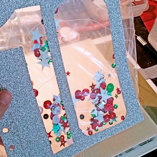 4. Next, I have used a basic A4 plastic sleeve that I'm sure you have lying around at home somewhere, and filled it with some sequins.