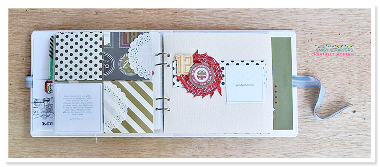 Very simple page. Have some fun by adding lots of little words that have significance to your festive period on one of the 4x4 pieces of paper. Punch one of the cards in the ephemera pack and add it on its own on top of the album sleeve.