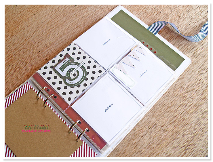 5. Mount your pocket over the ribbon on the inside left cover and on the inside right cover, use some patterned paper if you like.