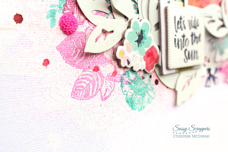 I was very inspired by the organic elements in the board. The florals and also the script writing. Once I was happy with the amount of interest I had created with the stamping and misting, I began to add my elements like die cuts leaves, to build up the botanical theme.