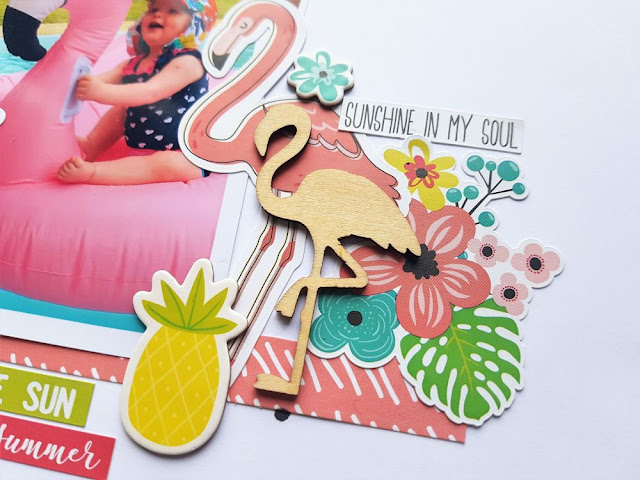 I tucked in the palm tree die cut on the top right of my photo to draw in some of the green colour and create a visual triangle. The wood veneers that I have this month aren't actually from the Hello Summer collection, however they go perfectly! I used the flamingo (of course!) and one of the small flowers from the wood veneer pack.