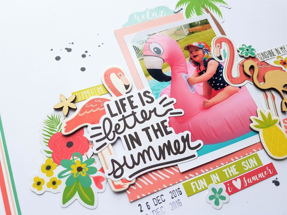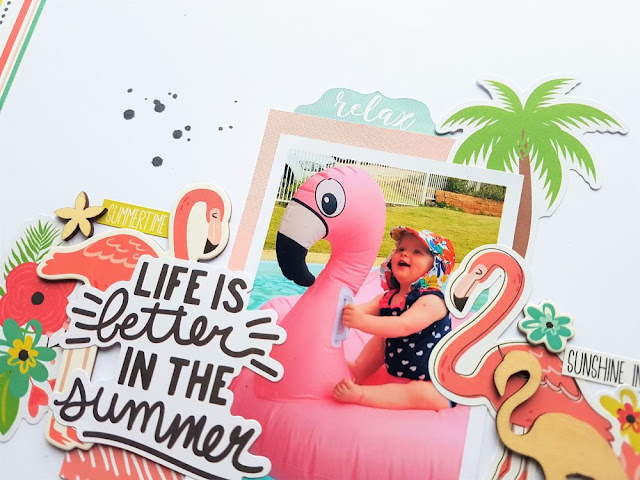 I love that saying, 'Life is Better in the Summer' so this was the perfect title piece layered over the flamingo on the left. I also added some of the fun phrase stickers for some pops of colour around the page too. The florals in this collection are soooo pretty and I couldn't resist adding a few of those onto my page too!