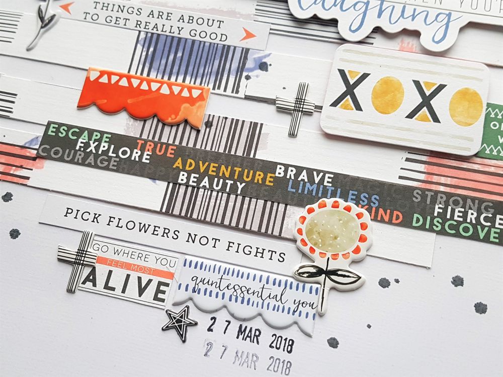 I popped the title up using some foam tape and placed it directly under my photo. I then picked out lots of the embellishments that were suited to not only the theme of my layout but also to the design and the colour scheme. I always try to design my page so that it is visually pleasing to the eye.