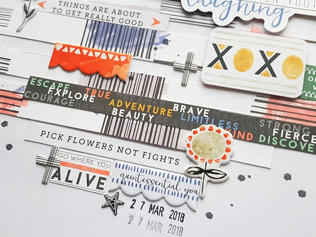 I used some of the cool ephemera pieces, chipboard pieces and puffy stickers to embellish my layout.