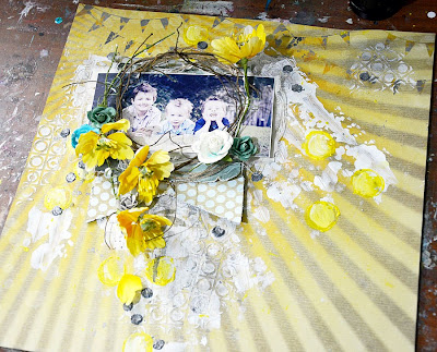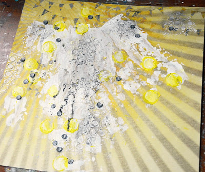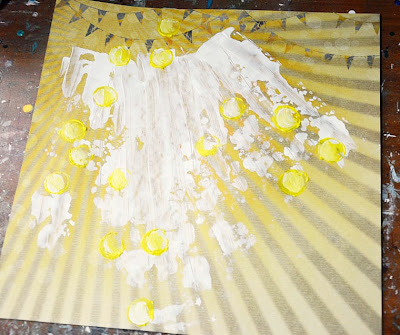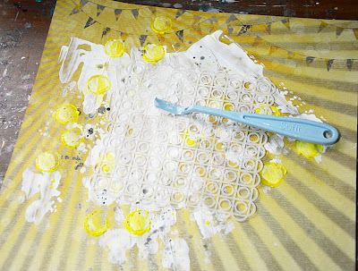 Step 2. Using the lid off one of my Shimmerz bottles I dipped into the Lemon Drop Dazzlers and added some circles to the page. I then used a paint brush to add a little Gesso and Lemon Drop to the centre of the circles.