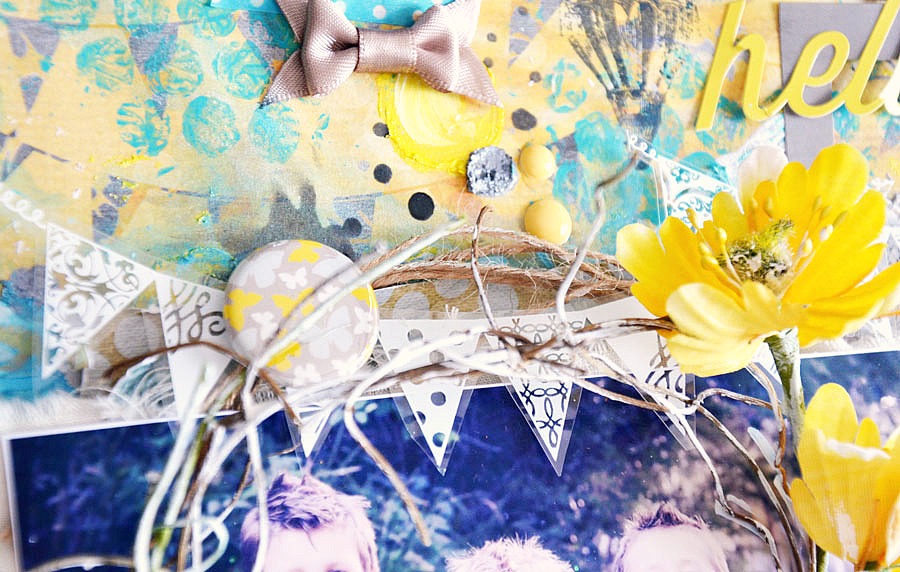 Step 13. Adhere some accent stickers to your page using foam tape. Here I have added the frame, hello word, washi pieces, arrows and the heart. Attach the bow at the top of the page along with the flair button on the banner.