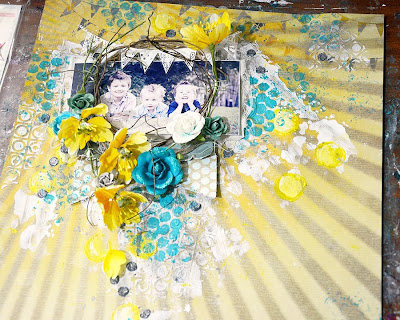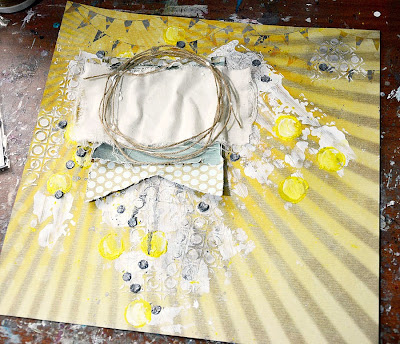 Step 1. Taking the Rays Paper as my background I used a piece of cardboard to scrape some Gesso down the page. I kept the direction of my strokes with the direction of the sun rays.