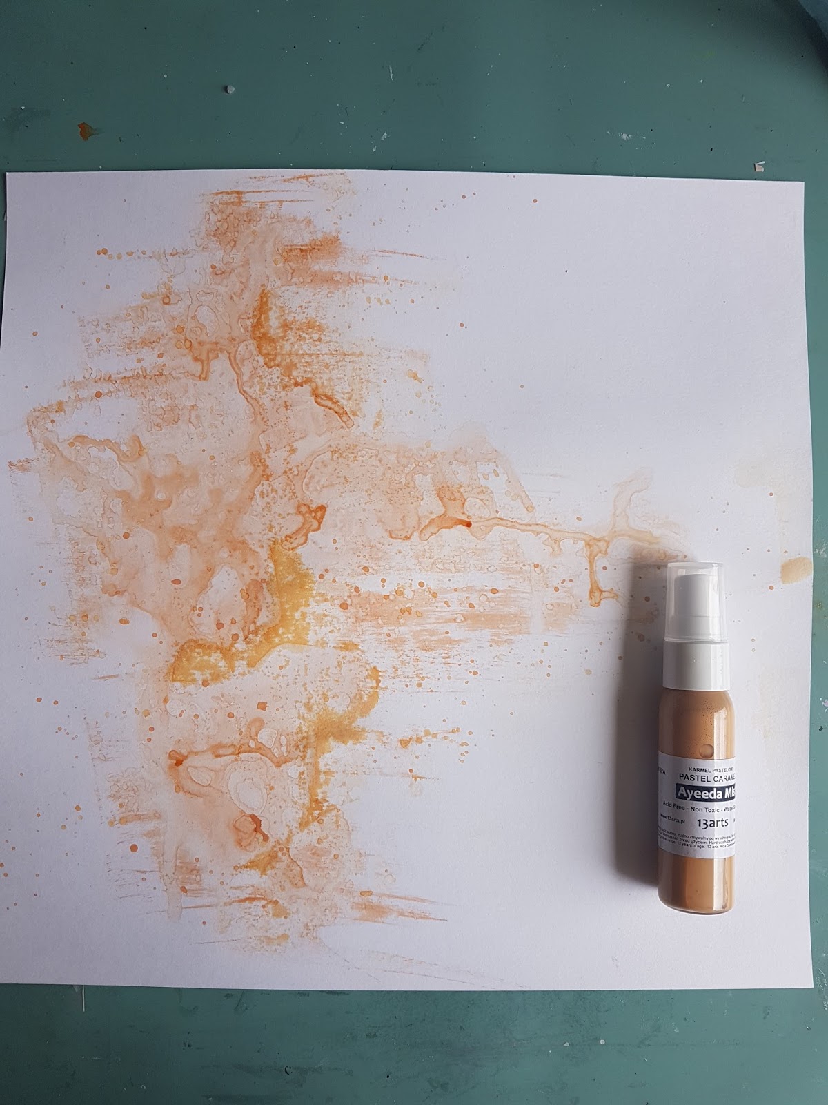 Once it was dry I then splattered 13arts Pastel Caramel Ayeeda Mist and dried again with my heat gun.