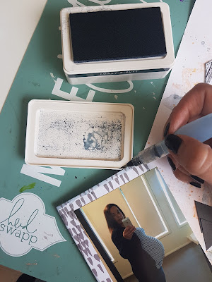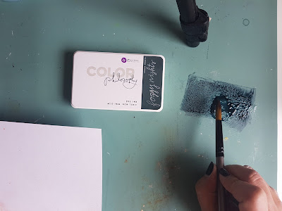 Next I stamped Prima Color Philosophy Dye Ink - Foggy Nights onto my craft mat and added some water. Using a paint brush I applied the ink to my layout. So that nothing was wasted, I used the left over ink to splatter onto my layout.