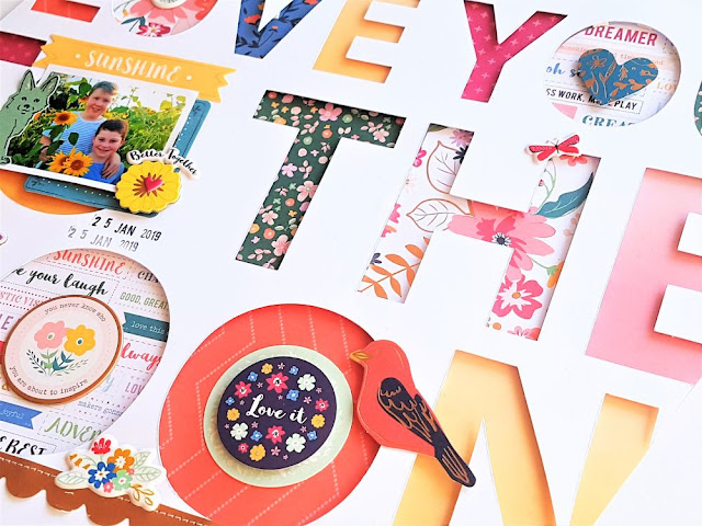 I also added some foam dots to a few of the embellishments to tie in with the dimension feel to this page. I did however keep the embellishing to a minimum because there was so much going on with all those different patterned papers. I clustered a few things around the photo of my boys and added a few other things here and there.