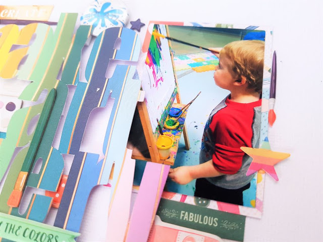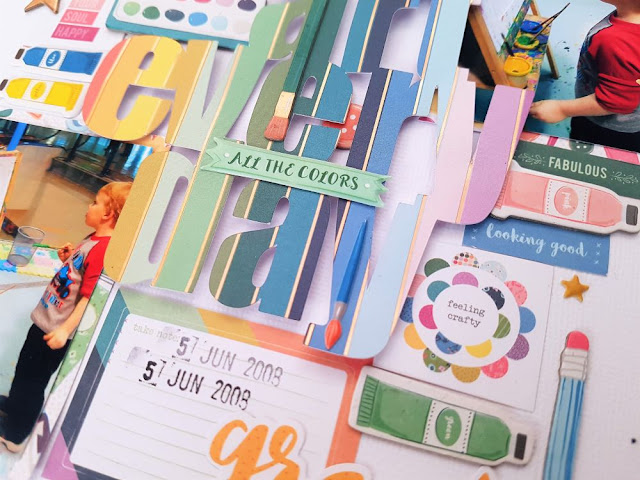 I added every single paintbrush and paint tube I could find from all the embellishments! I overlapped some of them on other elements and also placed them on their own. The 'Splat' flair button right at the top of the page is from my stash. I also included some of the stars in the chipboard and cardstock stickers too. I finished off with some splats of black mist and the date stamp.