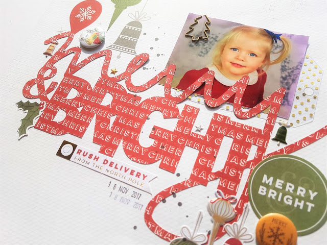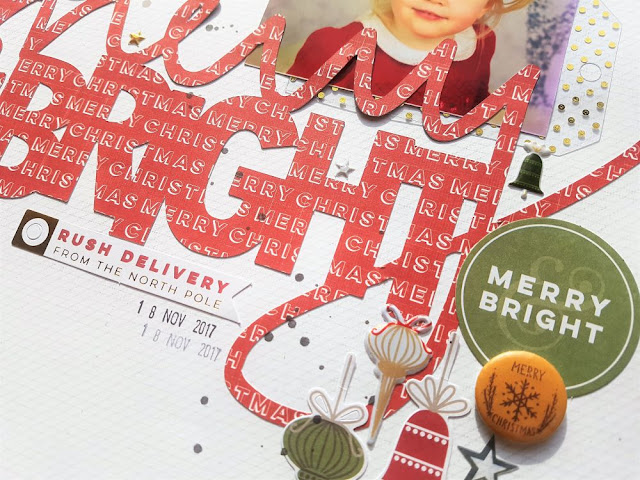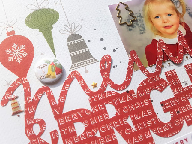 I added 2 flair buttons from my stash at home, I have such a massive flair collection so when I can use them up, I do! It was great to be able to get 2 on this page! I also added a few of the super cute bell, bauble and star puffy stickers around the cut file design.