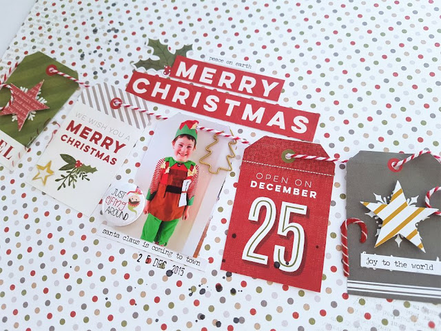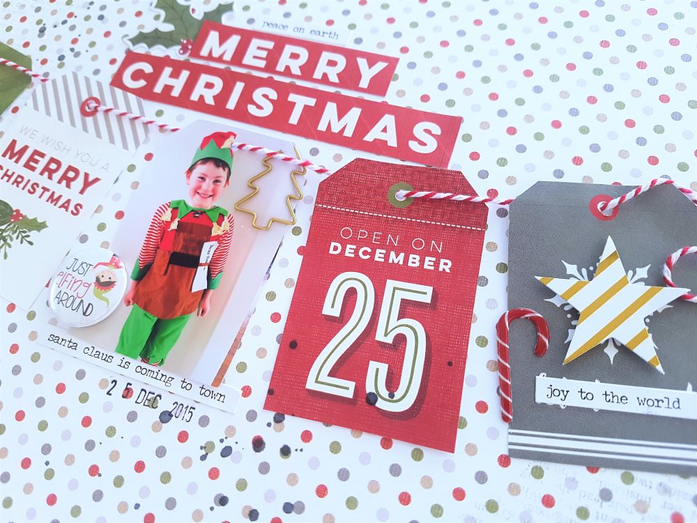 I threaded some red and white baker's twine through the holes in the tops of the tags and glued down the ends of the twine at the edge of the page. I also added one of the gorgeous gold tree clips to the right hand corner of my photo.