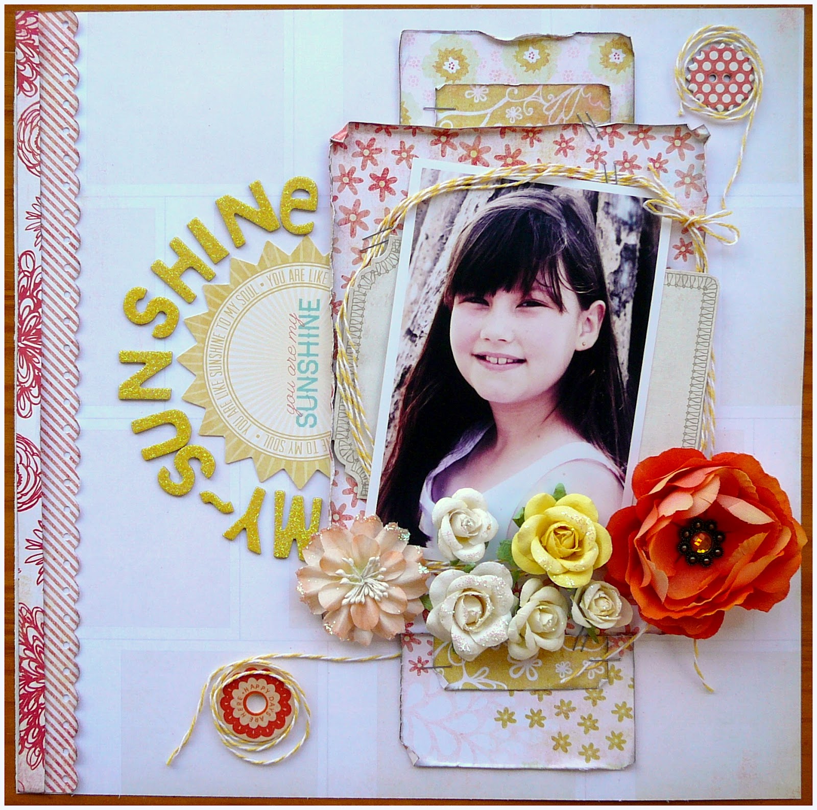 I love the "Sunshine Title" die cut! I used to sing that song to Em when she was a baby and it always used to make her go to sleep (probably trying to escape my terrible singing voice!). I used the gorgeous Thickers to reinforce the title around the die cut, and the glittery letters matched in perfectly with the beautiful glittery Prima Flowers.