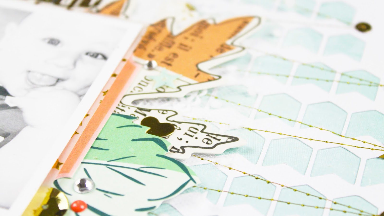 With all the action happening in the bottom right hand side of the page, I needed to add a little something to the top left corner to even things out a little. I used some offcuts of more leaves from the ephemera pack along with a word sticker and some enamel dots just to add a little interest.