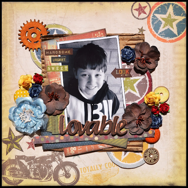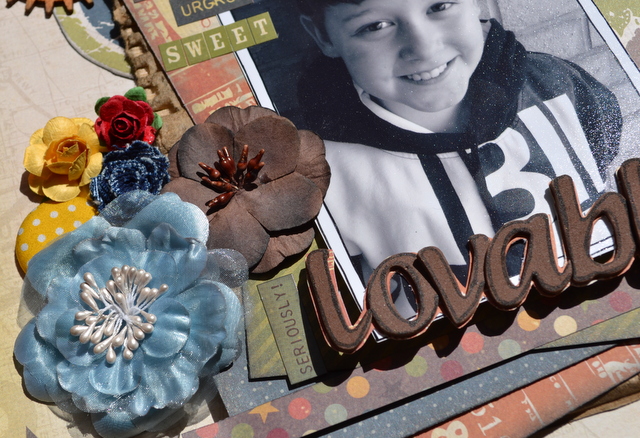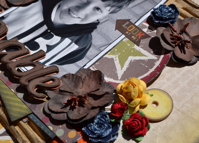 I used a piece of corrugated cardboard to layer my papers on, to give the layout a bit more dimension, and for a 'grungy' look. I used lots of flowers on this boyish page, which can give a layout a bit of a 'softer' feel, because boys aren't all about dirt and adventure - they can be sweet and lovable too!
