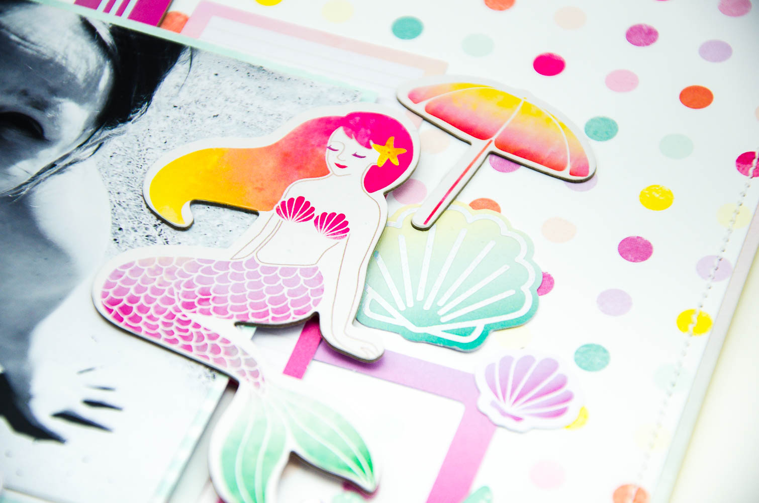 Next, I pulled out a stack of the frames from the Ephemera pack. I wanted to heap them up as the base for my photo mat. I just layered them up across one-third of my page crisscrossing at different angles. I then went about matting my photo and added some foam tape for dimension. Then it was time to add the mermaid, she was a perfect fit just to the right of my photo. The chipboard in this collection is so sweet, with lots of cute icons and I thought why not add the umbrella here as well as some cute shells from the ephemera pack.