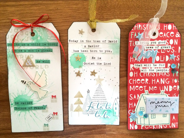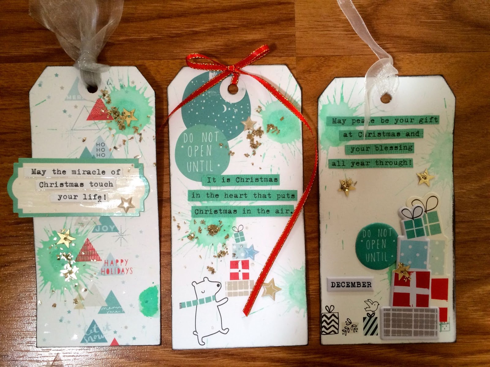 I typed out various Christmas quotes and attached one to each tag. Then I set about decorating each tag with puffy sticks and die cut ephemera. Some Prima Marketing glass glitter and sequins and then various ribbons to finish off each tag.