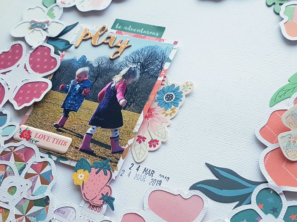 I tucked a few of the green leaves from the ephemera pack on the outside as well as the inside of the cut file, I love how these look as the cut file has just flowers, these leaves were perfect to add. On the right of my photo, I tucked in one of the die-cut flower clusters and I layered my title, 'Play' on top of the photo plus the cute puffy sticker that says, 'Love This'. I thought those super cute strawberries looked pretty at the bottom of my photo also!